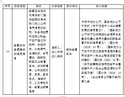 三、本目录共纳入公共信用信息 13 类,包括登记注册基本信息、司法裁判及执行信息、行政管理信息、职称和职业信息、经营( 活动)异常名录(状态)信息、严重失信主体名单信息、合同履行信息、信用承诺及履行情况信息、信用评价结果信息、遵守法律法规情况信息、诚实守信相关荣誉信息、知识产权信息和经营主体自愿提供的信用信息。有关机关根据纪检监察机关、检察机关通报的情况或意见,对行贿人作出行政处罚和资格资质限制等处理,拟纳入公共信用信息归集范围的,应当征求有关纪检监察机关、检察机关的意见。