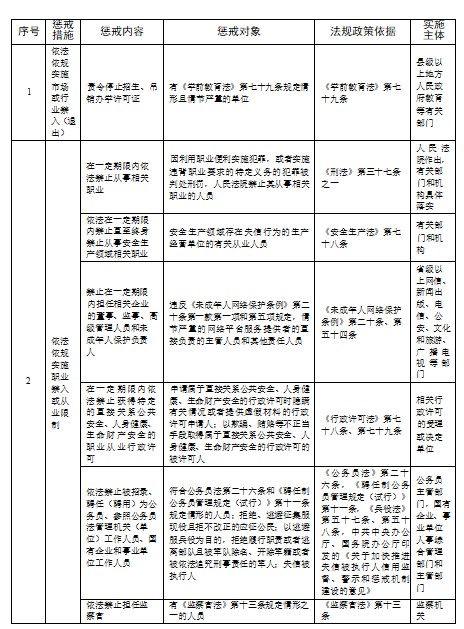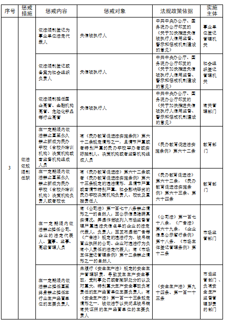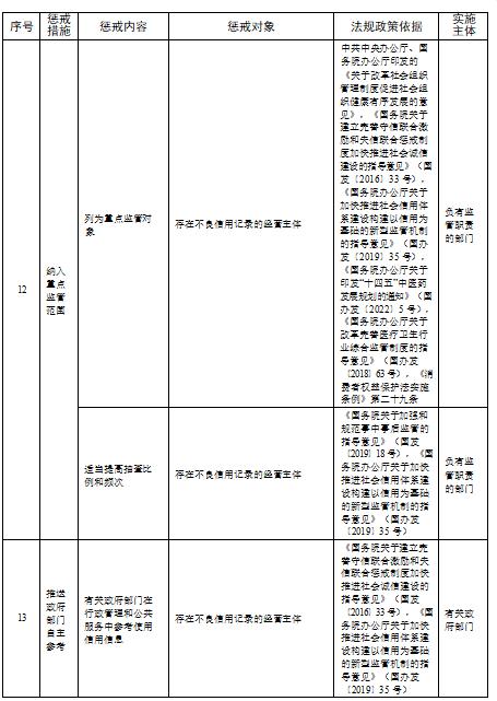 三、本清单所列失信惩戒措施包括三类,共 14 项:一是由公共管理机构依法依规实施的减损信用主体权益或增加其义务的措施,包括限制市场或行业准入、限制任职、限制消费、限制出境、限制升学复学等;二是由公共管理机构根据履职需要实施的相关管理措施,不涉及减损信用主体权益或增加其义务,包括限制申请财政性资金项 目、限制参加评先评优、限制享受优惠政策和便利措施、纳入重点监管范围等;三是由公共管理机构以外的组织自主实施的措施,包括纳入市场化征信或评级报告、从严审慎授信等。