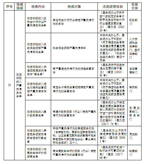为贯彻落实党中央、国务院关于推动社会信用体系高质量发展的决策部署,按照《中华人民共和国国民经济和社会发展第十四个五年规划和 2035 年远景目标纲要》《中共中央办公厅、国务院办公厅印发〈关于推进社会信用体系建设高质量发展促进形成新发展格局的意见〉的通知》《国务院办公厅关于进一步完善失信约束制度构建诚信建设长效机制的指导意见》要求,进一步规范失信惩戒措施,保护信用主体合法权益,国家发展改革委、中国人民银行会同国务院社会信用体系建设部际联席会议成员单位和其他有关部门(单位),严格以法律、行政法规和党中央、国务院政策文件为依据,编制本清单。