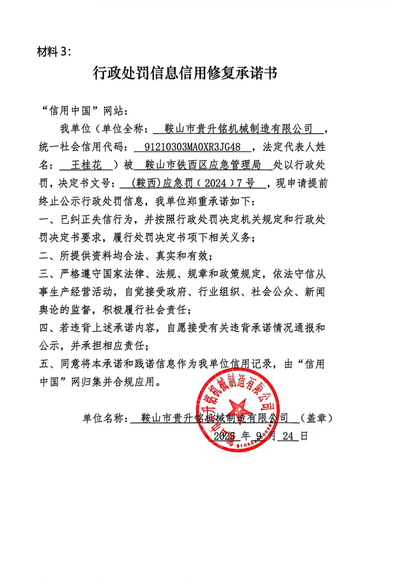 鞍山市贵升铭机械制造有限公司信用修复承诺书