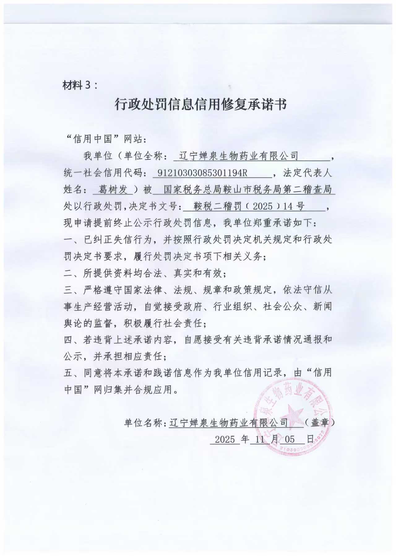 辽宁婵泉生物药业有限公司信用修复承诺书
