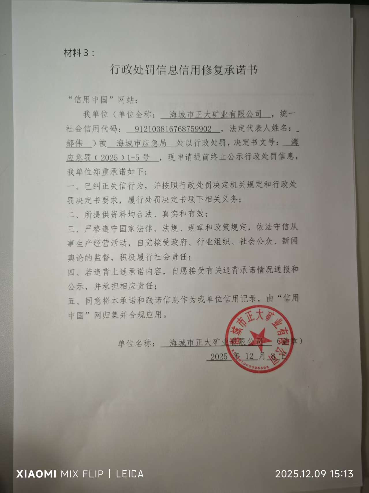海城市正大矿业有限公司信用修复承诺书