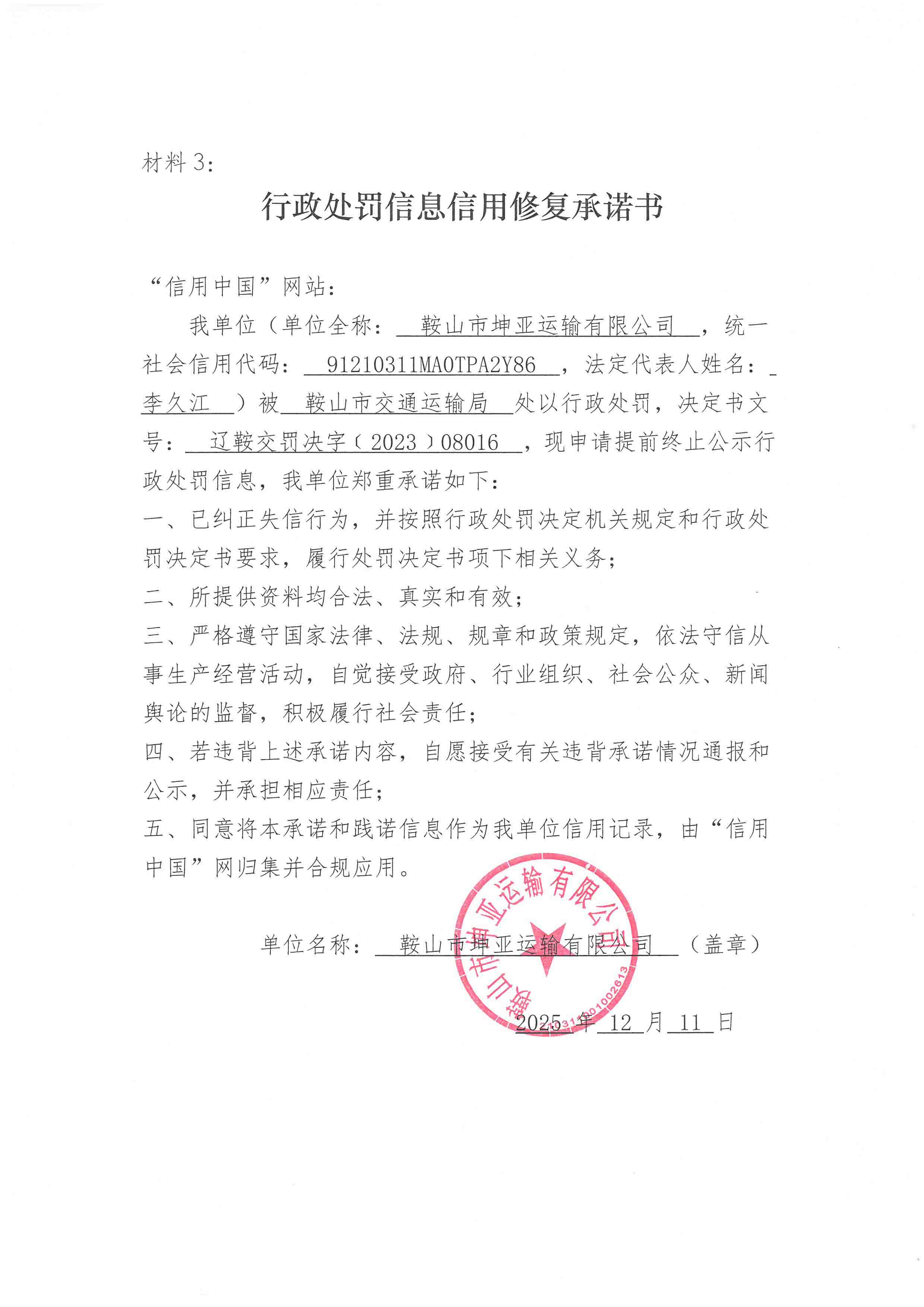 鞍山市坤亚运输有限公司信用修复承诺书