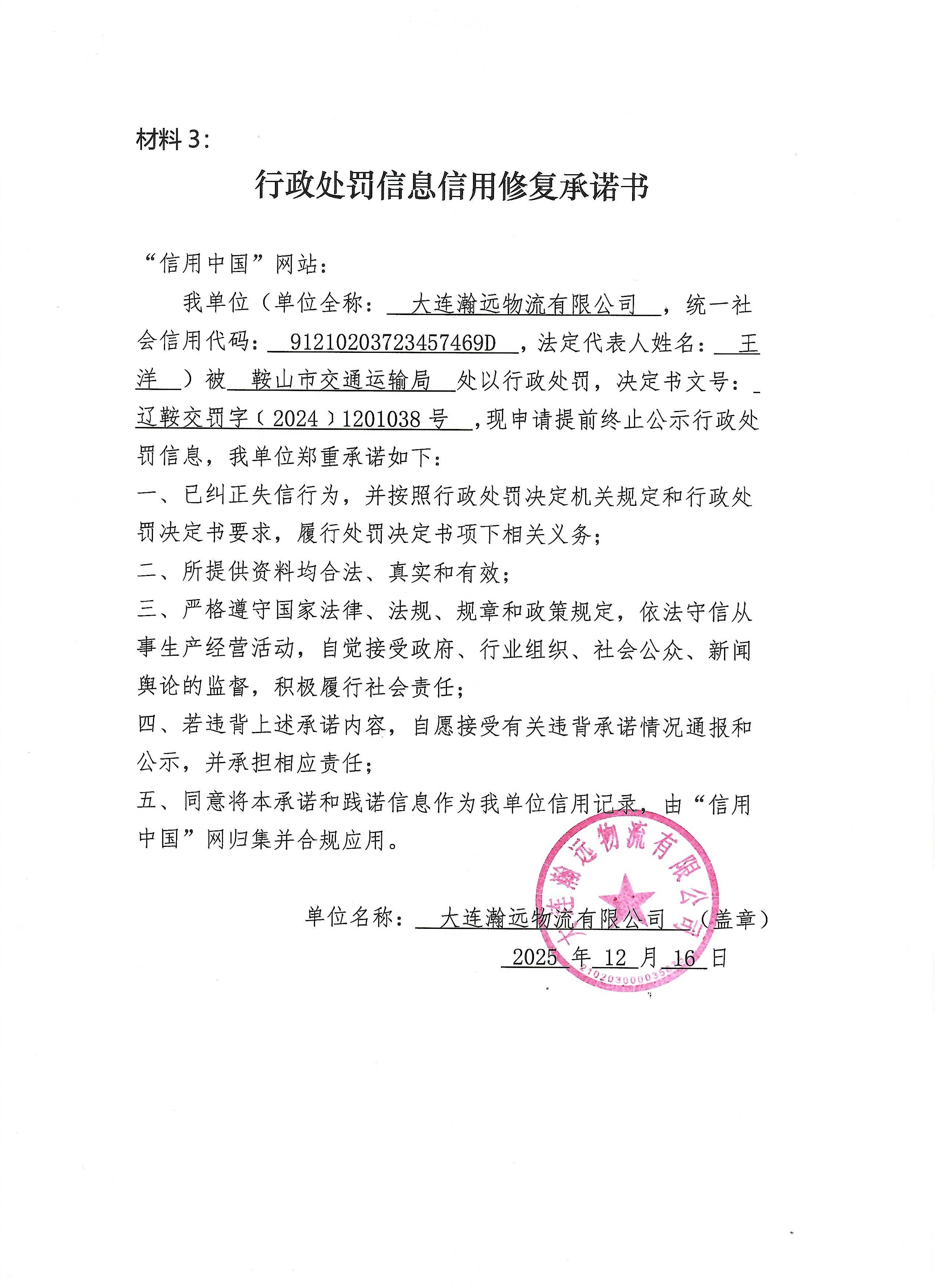 大连瀚远物流有限公司信用修复承诺书