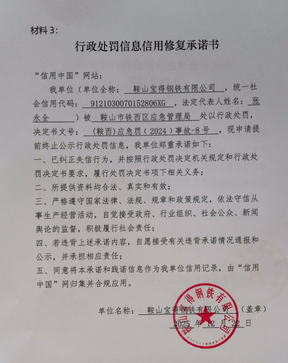 鞍山宝得钢铁有限公司信用修复承诺书