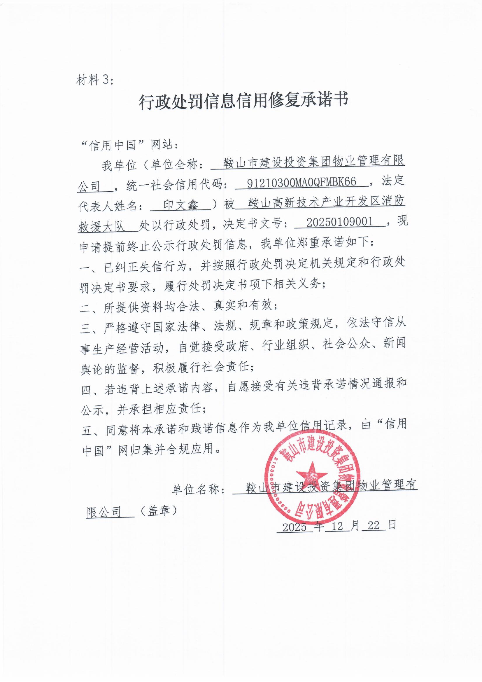 鞍山市建设投资集团物业管理有限公司信用修复承诺书