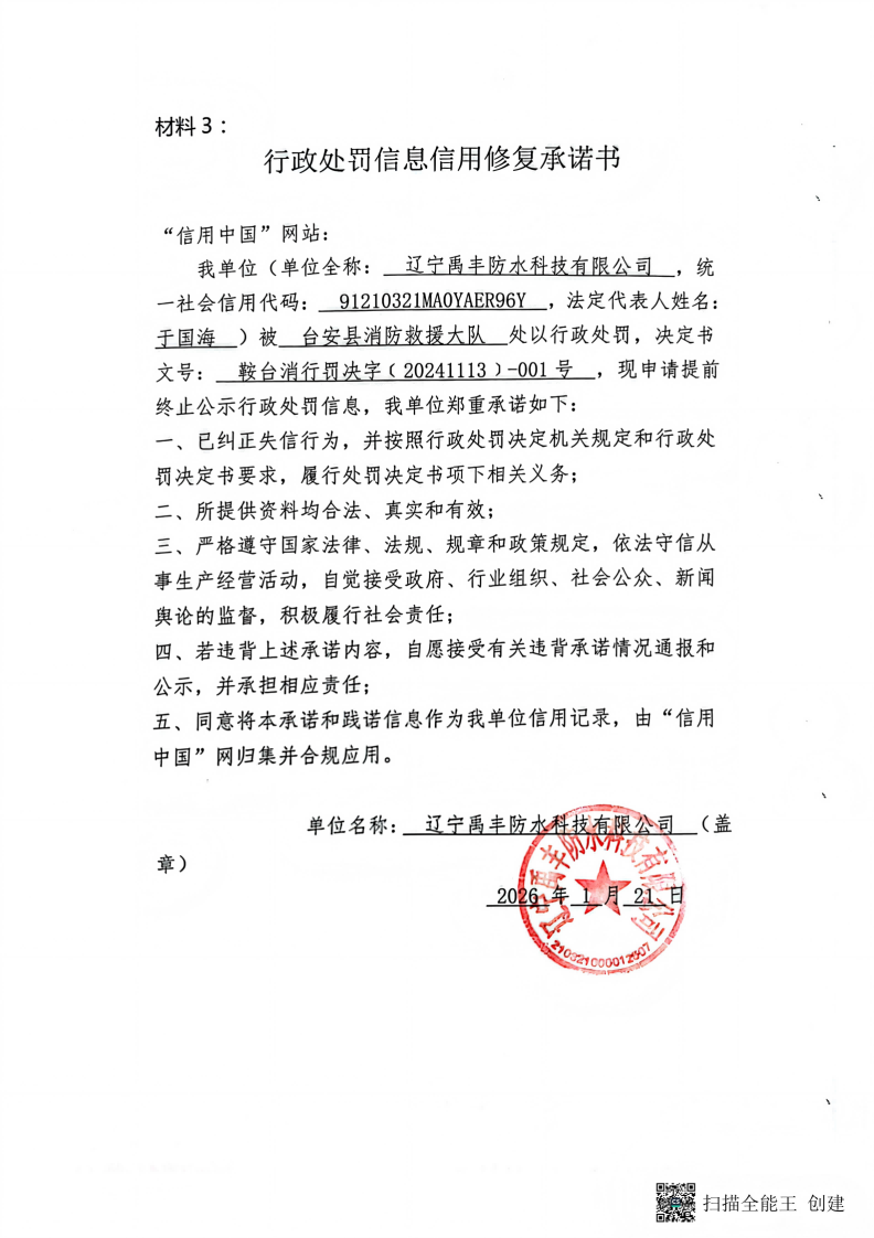 辽宁禹丰防水科技有限公司信用修复承诺书